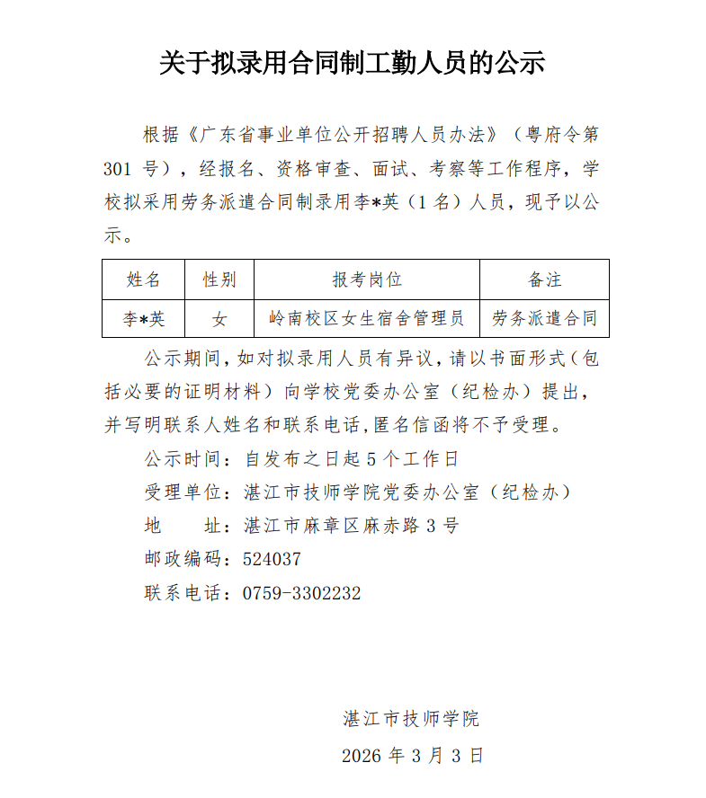 关于拟录用合同制工勤人员的公示