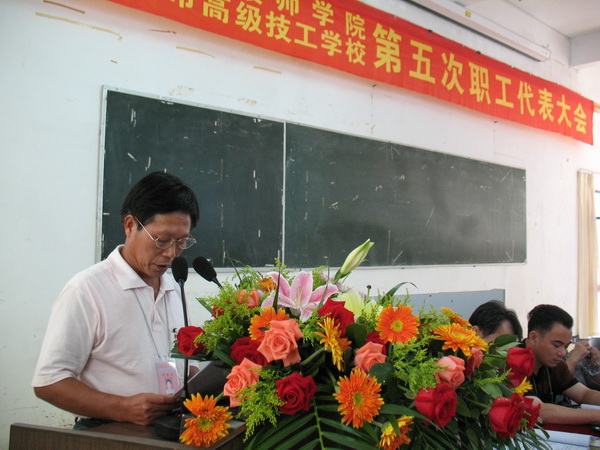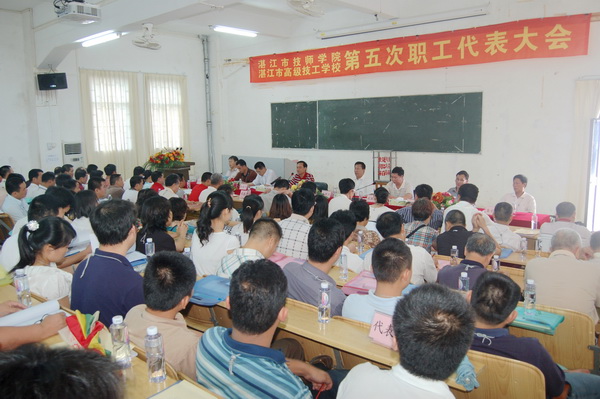 我校副院长(校长)陈桐主持了会议,副院长(校长)刘英业同志致开幕词。湛江市工会郭海勇主席发表了讲话。他代表湛江市工会为我校第五次职工代表大会送来了美好的祝福,他充分肯定了我校近几年的工作业绩,并提出了两点宝贵意见:第一,勉励教职工要坚持学习,增强技术本领;第二,他希望工会能更好的发挥桥梁和纽带的作用,积极开展各项丰富多彩的活动,营造和谐校园氛围。
