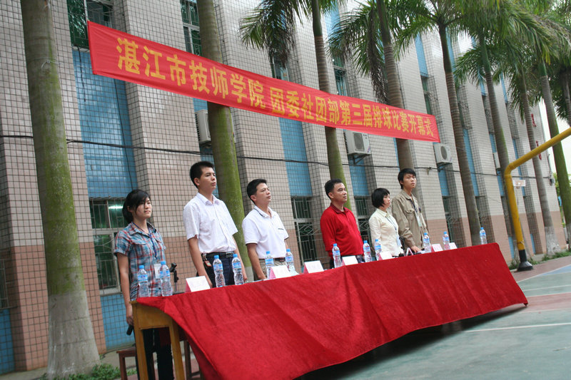 2010年4月13日下午,由湛江市技师学院团委主办,校团委社团部协办的社团部第三届排球比赛正式拉开了帷幕。学校学生处廖振处长、校团委李淑霞副书记、信息技术系团委黄继乐书记、电气工程系黄世东书记,社团部韩文豪同学以及社团部各部门代表和学生会代表出席了开幕式。校团委李淑霞副书记致开幕辞,她说:“团委社团部以服务促建设,以服务求活跃为宗旨,积极开展了形式多样,丰富多采的校园文化活动,繁荣了校园文化的活跃性,积极围绕学校的高端带动,内涵发展,解放思想,开拓创新的思路,进一步活跃校园文化,丰富了同学们的课余生活,促进学校社团部和学生会间技术与情感的交流”。裁判员和运动员代表宣誓,学生处廖振处长宣布了比赛开幕。