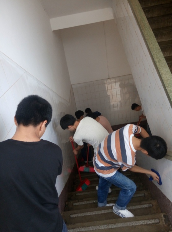 周围的把手和瓷壁都清洁完成,最终还需用水把楼梯冲一遍。所有参与人员都积极的参与在了其中