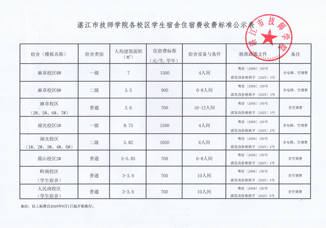 湛江市技师学院各校区学生宿舍住宿费收费标准公示